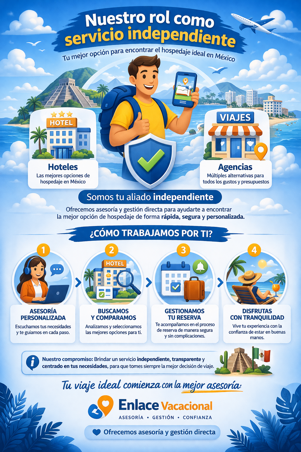 Al utilizar nuestros servicios de asesoría y gestión de reservas de hoteles en México, es fundamental que comprendas que Enlace Vacacional opera como un servicio independiente. No somos el proveedor directo de los hoteles ni una agencia de viajes oficial. Nuestra función es facilitar tu búsqueda y brindarte orientación personalizada.