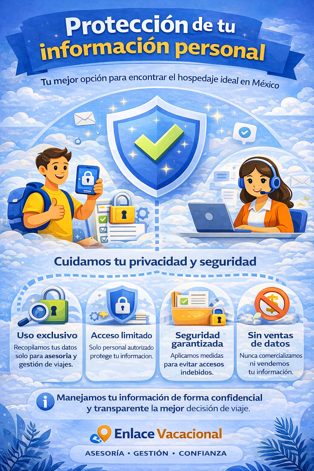 En Enlace Vacacional, la seguridad y el uso adecuado de tu información personal son de máxima prioridad. Implementamos medidas de seguridad robustas para proteger los datos que compartes con nosotros al buscar y reservar tus viajes.